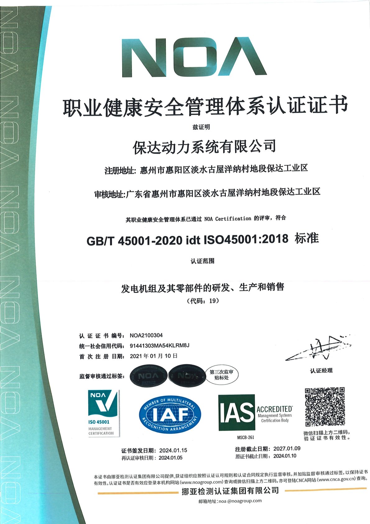 职业健康安全认证证书